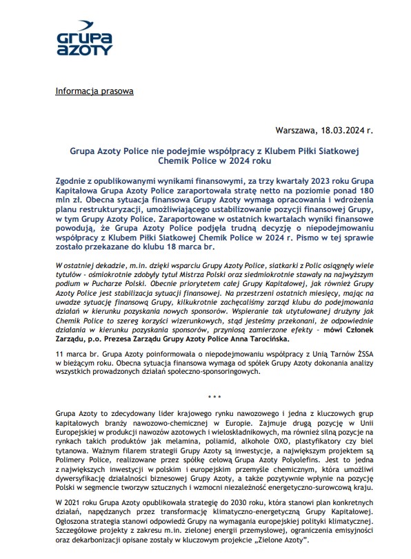 Obecna sytuacja finansowa wymaga od spółek Grupy Azoty dokonania analizy wszystkich prowadzonych działań społeczno-sponsoringowych. Zgodnie z opublikowanymi wynikami finansowymi, za trzy kwartały 2023 roku Grupa Kapitałowa Grupa Azoty Police zaraportowała stratę netto na poziomie ponad 180 mln zł. Obecna sytuacja finansowa Grupy Azoty wymaga opracowania i wdrożenia planu restrukturyzacji, umożliwiającego ustabilizowanie pozycji finansowej Grupy, w tym Grupy Azoty Police. Zaraportowane w ostatnich kwartałach wyniki finansowe powodują, że Grupa Azoty Police podjęła trudną decyzję o niepodejmowaniu współpracy z Klubem Piłki Siatkowej Chemik Police w 2024 r. Pismo w tej sprawie zostało przekazane do klubu 18 marca br.