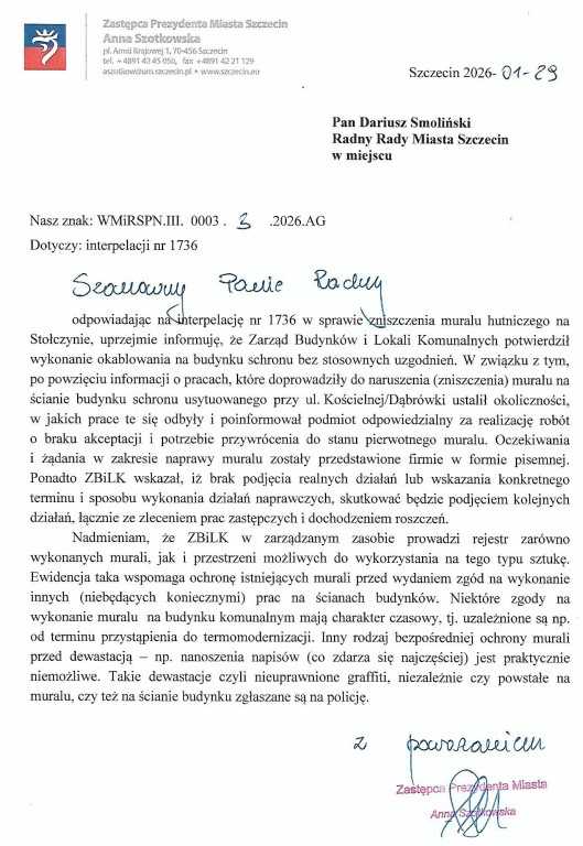 odpowiadając na interpelację nr 1736 w sprawie zniszczenia muralu hutniczego na Stołczynie, uprzejmie informuję, że Zarząd Budynków i Lokali Komunalnych potwierdził wykonanie okablowania na budynku schronu bez stosownych uzgodnień. W związku z tym, po powzięciu informacji o pracach, które doprowadziły do naruszenia (zniszczenia) muralu na ścianie budynku schronu usytuowanego przy ul. Kościelnej/Dąbrówki ustalił okoliczności, w jakich prace te się odbyły i poinformował podmiot odpowiedzialny za realizację robót o braku akceptacji i potrzebie przywrócenia do stanu pierwotnego muralu. Oczekiwania i żądania w zakresie naprawy muralu zostały przedstawione firmie w formie pisemnej.