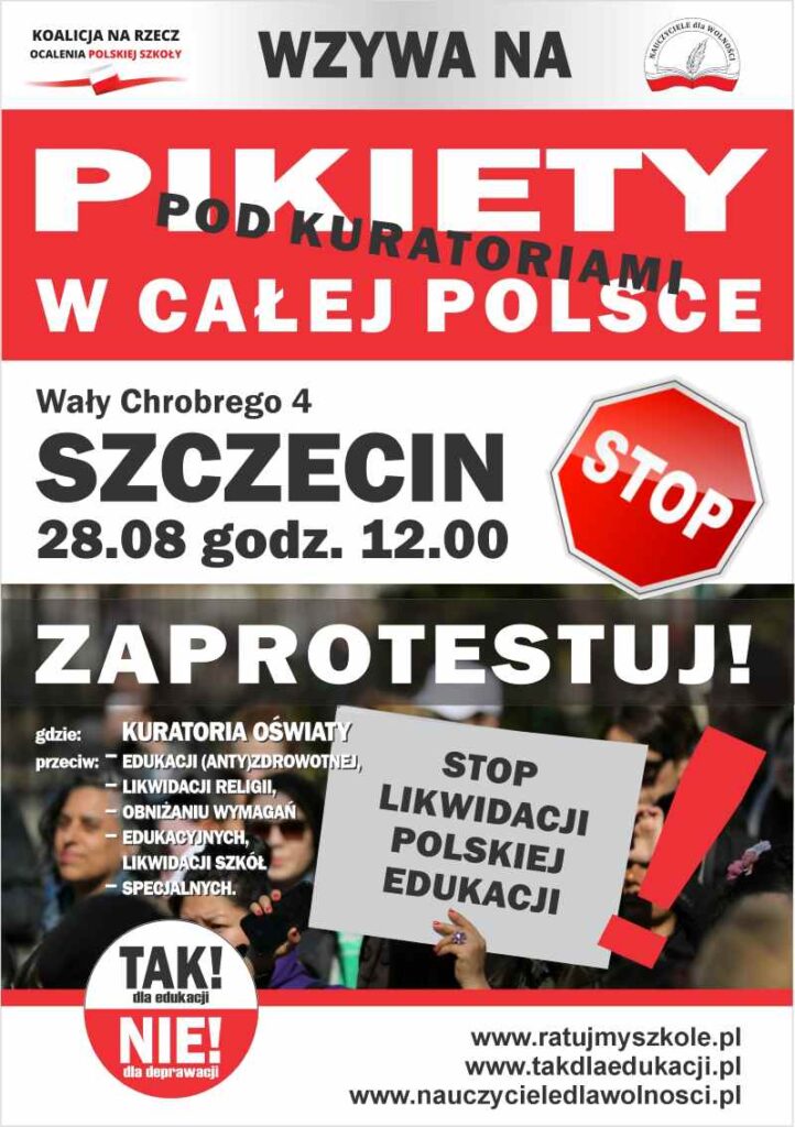 Koalicja na Rzecz Ocalenia Polskiej Szkoły (KROPS), zrzeszająca 87 organizacji pozarządowych, ogłosiła ogólnopolską akcję protestacyjną. Pikiety i konferencje prasowe odbędą się pod kuratoriami oświaty w Szczecinie już 28 sierpnia.