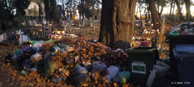 W środę 30.10 na cmentarzu na Golęcinie pojawiły się ekipy porządkowe. Pomiędzy mieszkańcami sprzątającymi groby bliskich chodzili z kosiarkami i kosili liście. Wydawać by się mogło, że na Wszystkich Świętych wszystko będzie ogarnięte. Niestety. Jakże mocno się zdziwili ci, co przybyli 1 listopada na cmentarz. Takiego obrazu nie spodziewali się ujrzeć. Cmentarz przypominał bardziej wysypisko śmieci niż cmentarz.