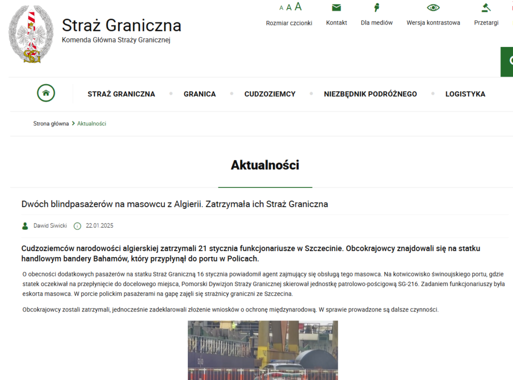 Cudzoziemców narodowości algierskiej zatrzymali 21 stycznia funkcjonariusze w Szczecinie. Obcokrajowcy znajdowali się na statku handlowym bandery Bahamów, który przypłynął do portu w Policach.