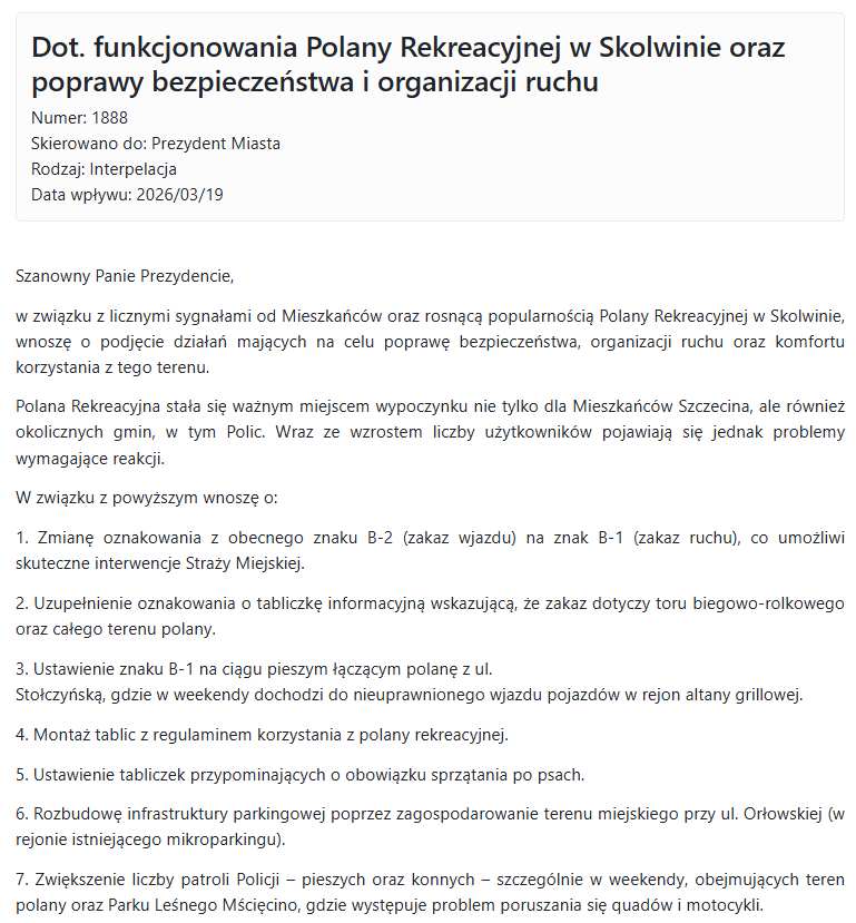 Na sygnały mieszkańców zareagował również radny Dariusz Smoliński, który złożył interpelację w sprawie poprawy bezpieczeństwa i organizacji ruchu wokół polany. Zwraca on uwagę, że
